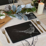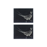 A set of two rectangular slate place mats engraved with a stunning hand-illustrated drawing of a pheasant - these will provide a lovely and unique table setting to serve your dishes onto and will add a classic touch to your home.