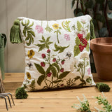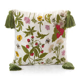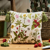Stunning cushion embroidered with a beautiful design featuring strawberries flowers and bees. Green tassels on each corner.