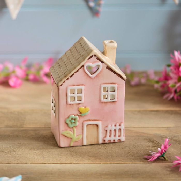 Ceramic tea light holder shaped like a pink house with an embossed and painted flower design, heart-shaped window, and beige roof with chimney.
